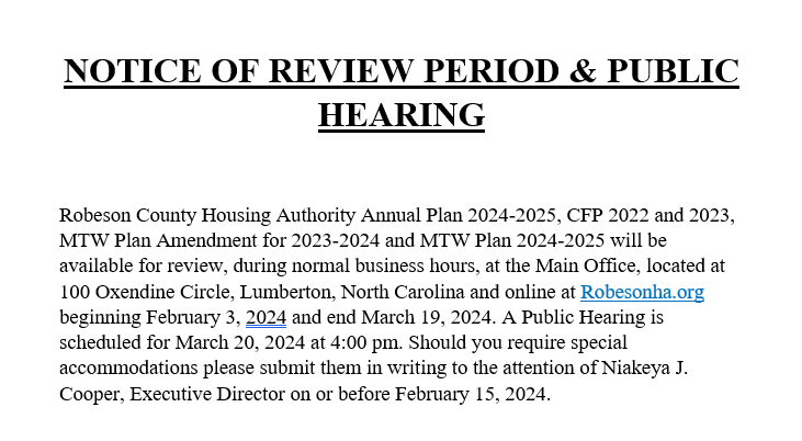 Robeson County Housing Authority Annual Plan 2024-2025, CFP 2022 and 2023, MTW Plan Amendment for 2023-2024 and MTW Plan 2024-2025 will be available for review, during normal business hours, at the Main Office, located at 100 Oxendine Circle, Lumberton, North Carolina and online at Robesonha.org beginning February 3, 2024 and end March 19, 2024. A Public Hearing is scheduled for March 20, 2024 at 4:00 pm. Should you require special accommodations please submit them in writing to the attention of Niakeya J. Cooper, Executive Director on or before February 15, 2024.